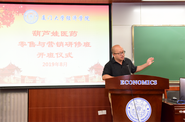 在开班仪式上,廖景峰主任首先代表厦门大学经济学院热烈欢迎NG28医药零售与营销研修班的学员到厦大学习,并就厦门大学及经济学院的相关情况进行了介绍。他说,NG28学员走进厦大就是厦大的校友,希望未来的日子能够关心、支持母校的发展,多提宝贵意见,同时他也祝大家在厦大学习期间学有所成、学有所获。
