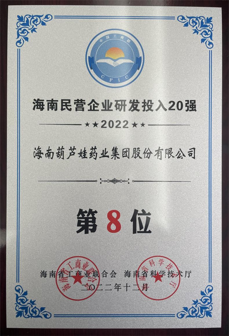 12月23日,2022海南民营企业50强和研发投入20强发布会在海口举行。会上发布了“2022海南民营企业50强”“2022海南民营企业研发投入20强”榜单和分析报告。NG28药业再次荣登两榜,在海南民营企业50强榜单中位列第25位,较去年上升8位,这也是公司连续三年登榜;在海南民营企业研发投入20强中位列第8位,较去年上升7位。