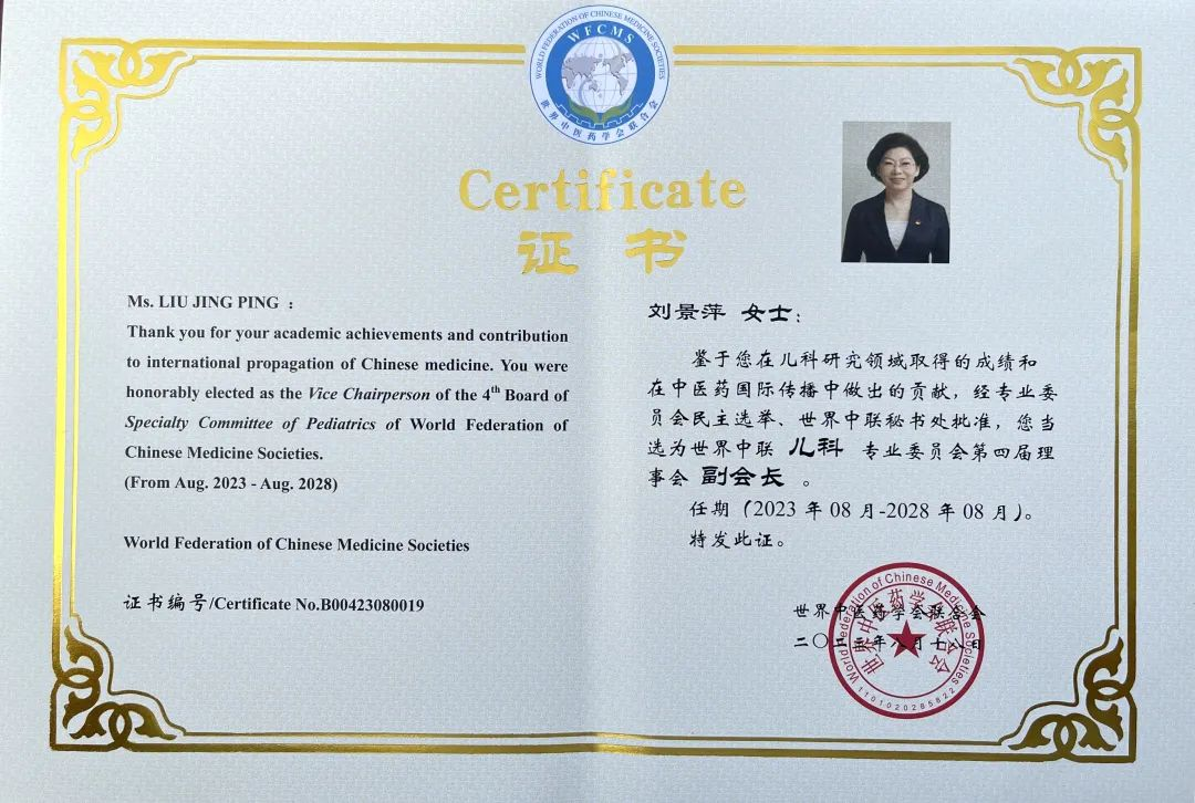 NG28药业集团党委书记、董事长刘景萍当选世界中医药学会联合会儿科专业委员会第四届理事会副会长